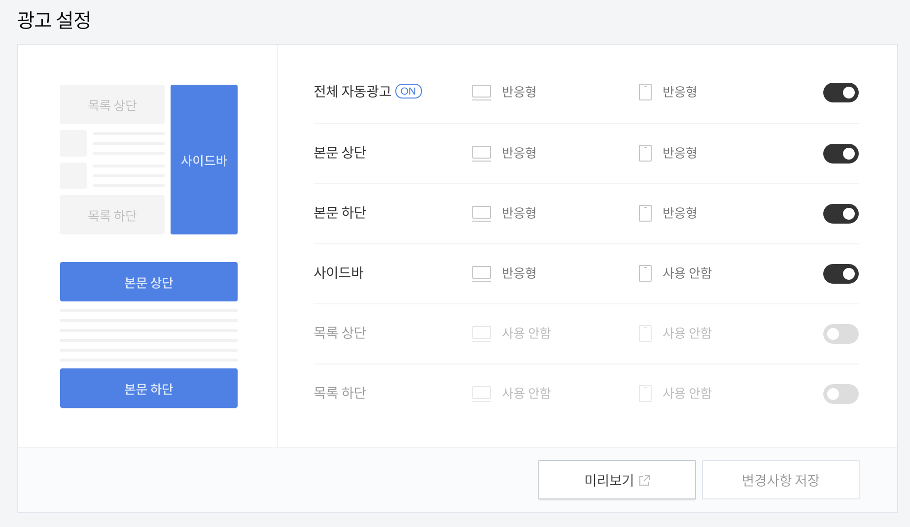 카카오애드핏(kakaoAdFit)이나 구글 애드센스(Adsense)를 편하게 연동하고 광고설정을 할수 있게 해줬습니다.