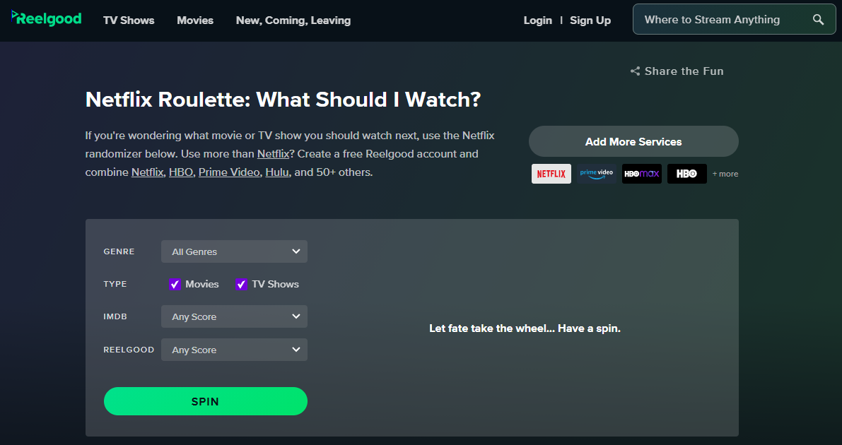 Wondering what to watch? Let Netflix Roulette pick a movie or TV show randomly from the Netflix catalog, filter IMDB score, and watch instantly.