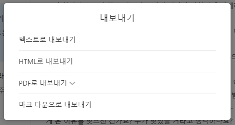 내보내기는 텍스트, HTML, PDF, 마크다운으로 내보낼 수 있습니다.