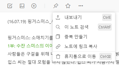 개별노트에서는 [ ··· ] 를 선택하거나 단축키 [ Ctrl + E ]를 통해 내보낼 수 있습니다.