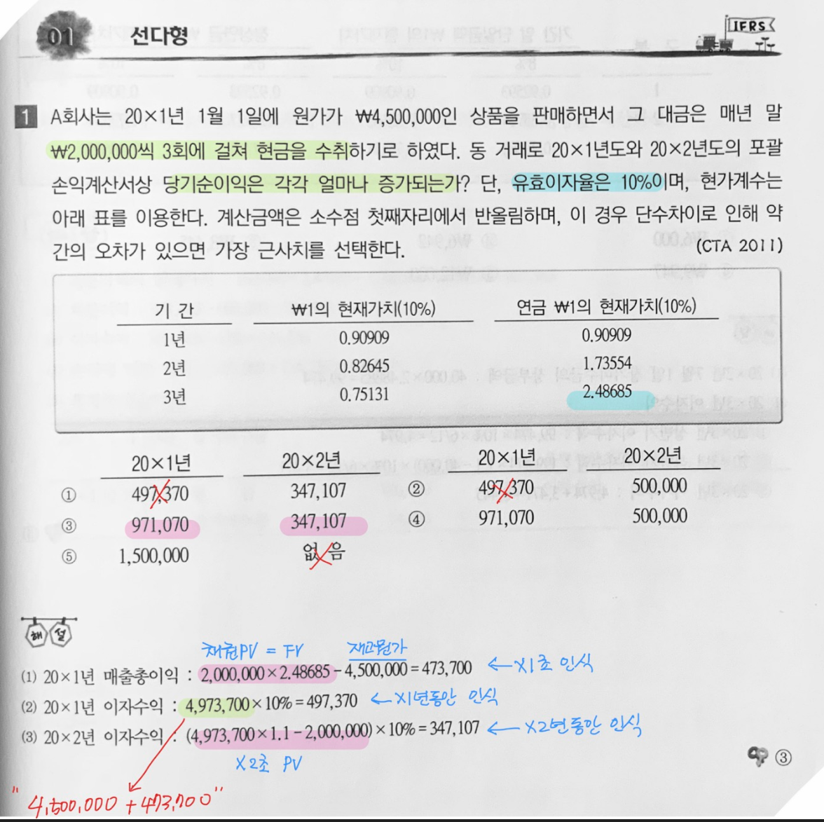장기성채권, 채무를 현재가치로 측정하면 손익의 총금액(total amount)은 차이가 없으며, 단지 인식할 손익의 귀속시기(timing)의 차이만 있을 뿐이다.