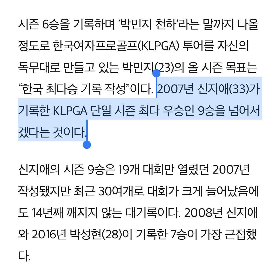올 시즌 박민지 선수가 5승을 달성 했는데, KLPGA 역대 1시즌 최다승은 2007년 000 선수의 9승이다.