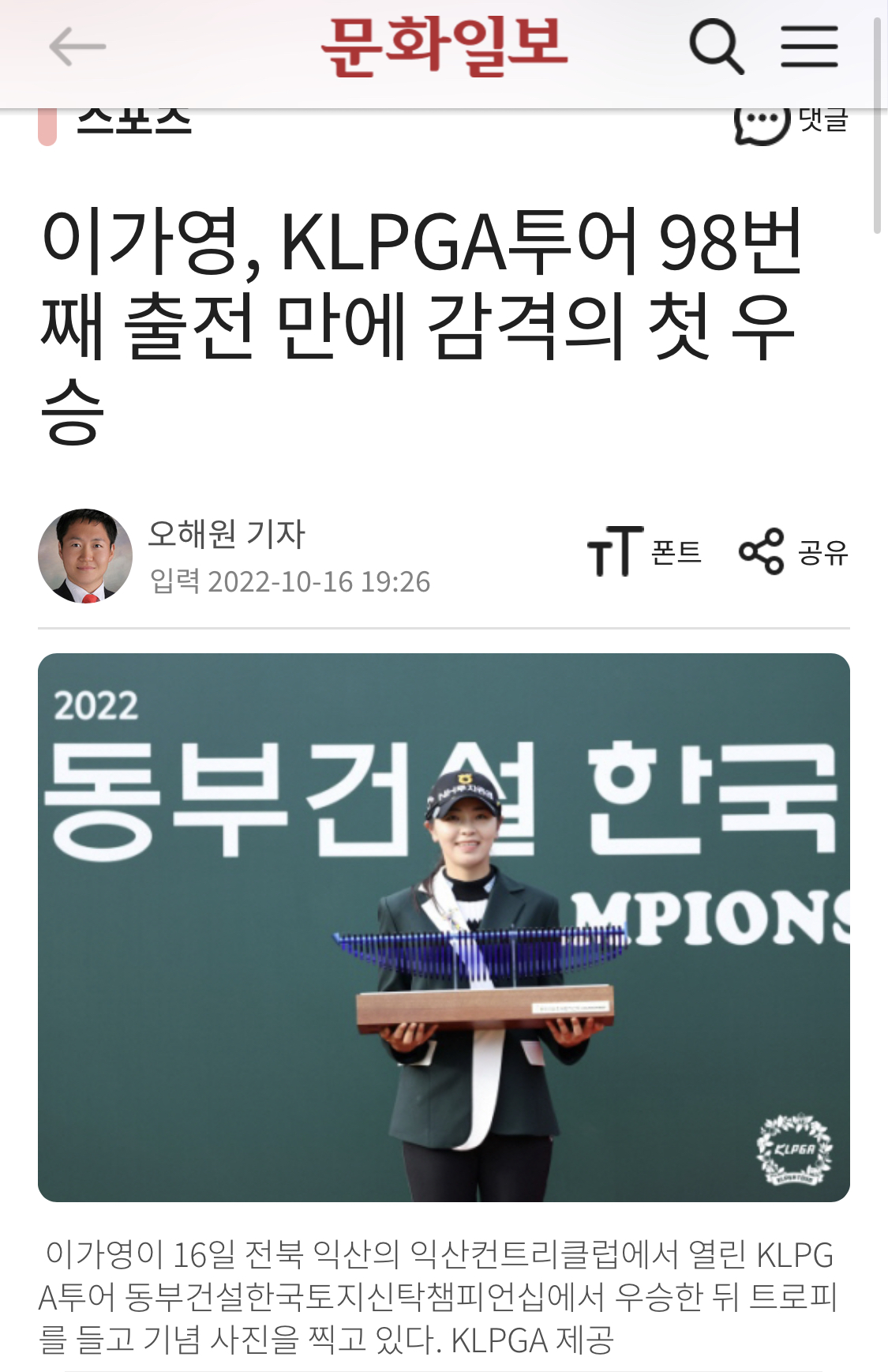 | (골프) 올 시즌 KLPGA 최초 2년 연속 상금 10억 원을 돌파한 선수는 프로이다. (0) | 2022.09.27 |