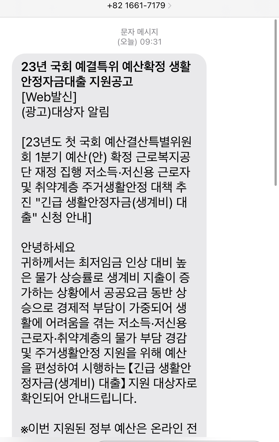 귀하께서는 최저임금 인상 대비 높은 물가 상승률로 생계비 지출이 증가하는 상황에서 공공요금 동반 상승으로 경제적 부담이 가중되어 생활에 어려움을 겪는 저소득·저신용 근로자·취약계층의 물가 부담 경감 및 주거생활안정 지원을 위해 예산을 편성하여 시행하는 【긴급 생활안정자금(생계비) 대출】 지원 대상자로 확인되어 안내드립니다.