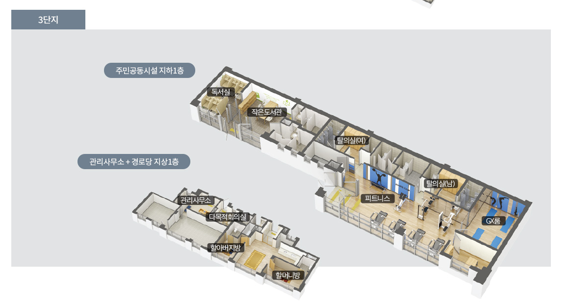 3단지는 GX룸이 있고 경로당과 관리사무소가 있습니다.