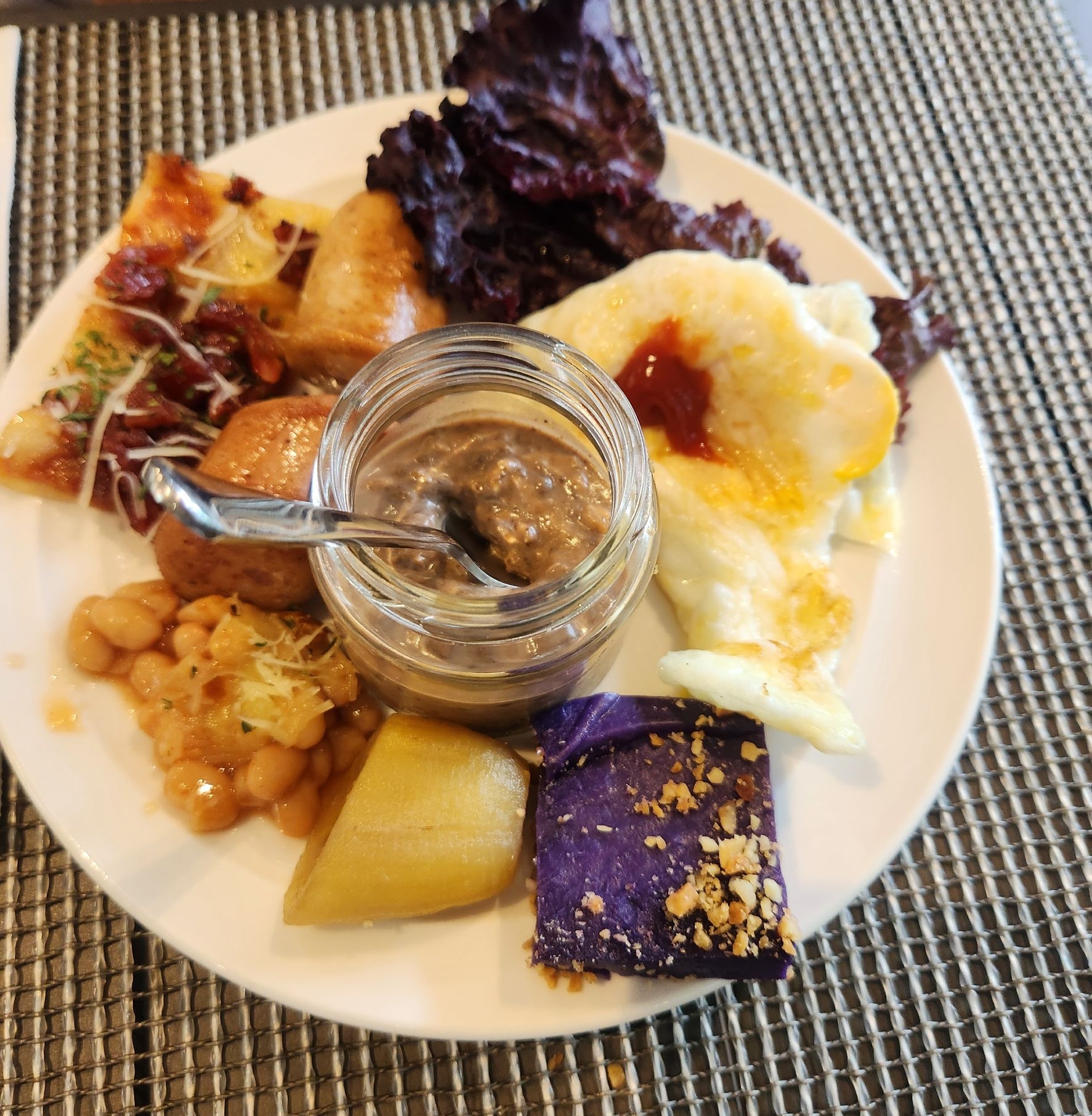 Breakfast is quite average. It’s available from around 7 to 10 AM. There is a limited selection of salad greens, but a variety of bread is offered. There are some meat options, but they are not particularly satisfying. At the egg station, you can choose from boiled eggs, sunny-side-up, or omelets, depending on your preference.