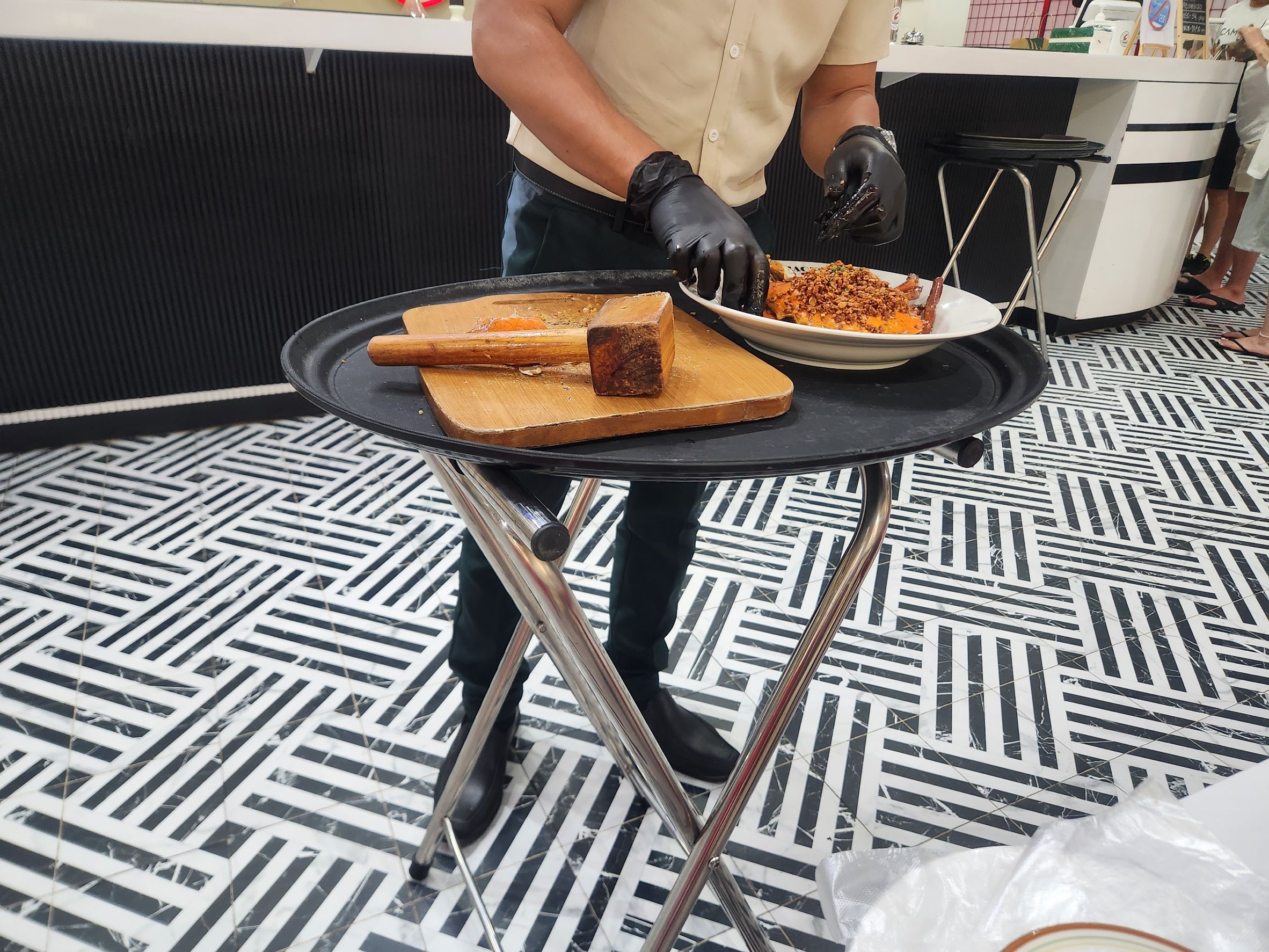 The restaurant manager also hammers and cracks the crab for you, making it easy to eat.