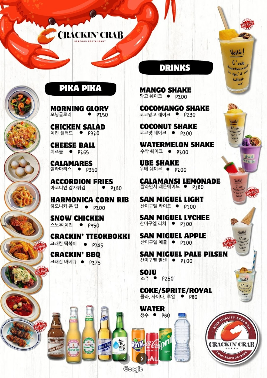 The menu features Crakin' Crab sets, which you can choose to be cooked in pure steam, butter garlic, sweet chili, black pepper, or creamy cheese.