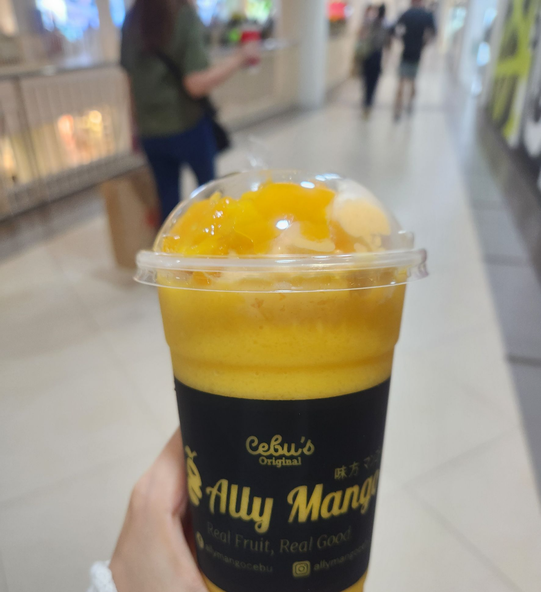 In Korea, if you visit a newly opened department store, you'll see a lot of pop-up stores in the middle, and it’s the same here. There’s a famous stall called "Ally Mango" where I tried a mango shake. It was delicious! The mango flavor was rich, and the sweetness was just right, making for a tasty shake.