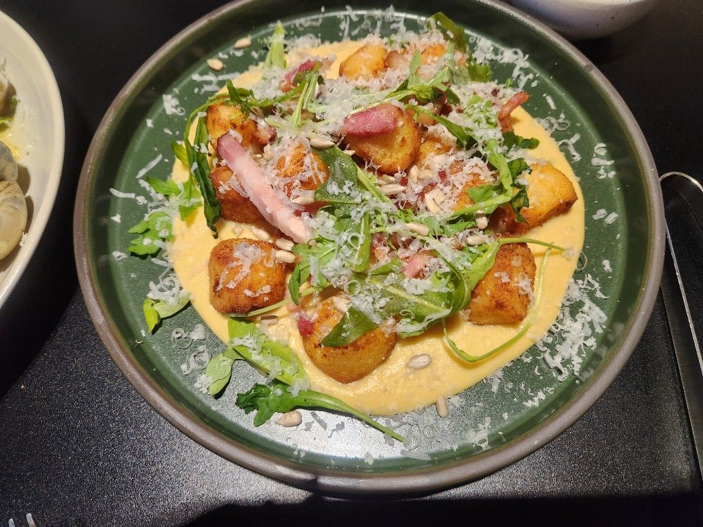 옥수수퓨레 & 뇨끼 - 햇감자, 옥수수 퓨레, 베이컨칩, 해바라기씨 등으로 만든 뇨끼입니다. 옥수수 퓨레가 고소함을 더하지만, 햇감자가 바삭한 식감보다는 사알짝 눅눅한 식감으로 조금 아쉽지만 맛있습니다. 베이컨칩과 해바라기씨가 식감에 재미를 더해주지만, 추천하지는 않습니다.
