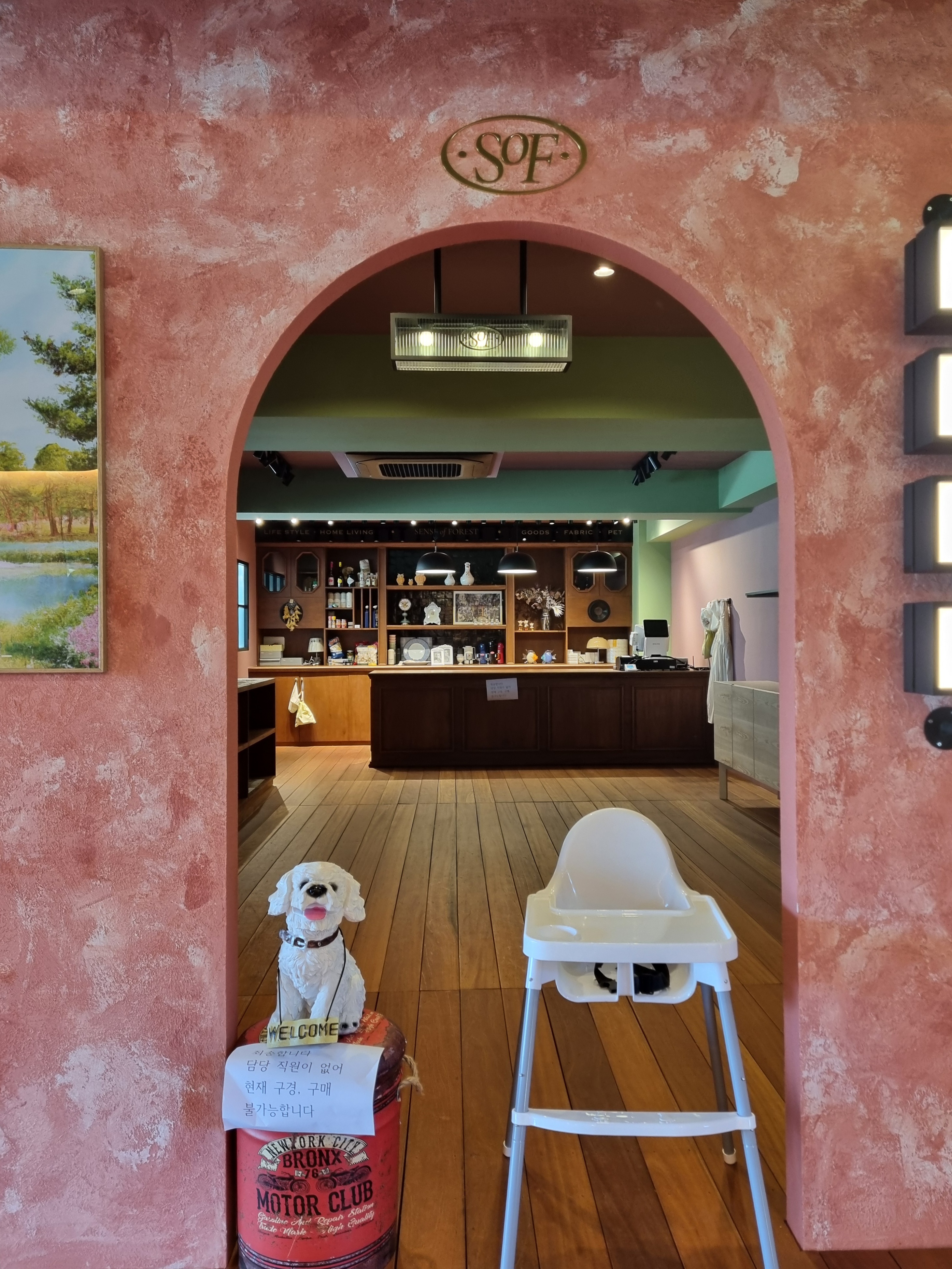 대형 카페 옆에 작게 카페 및 셀렉트샵이 있고 아직 직원이 없어서 오픈은 하지 않은 것으로 보입니다. 작은 소품 이나 기념품 판매를 할 것같습니다.