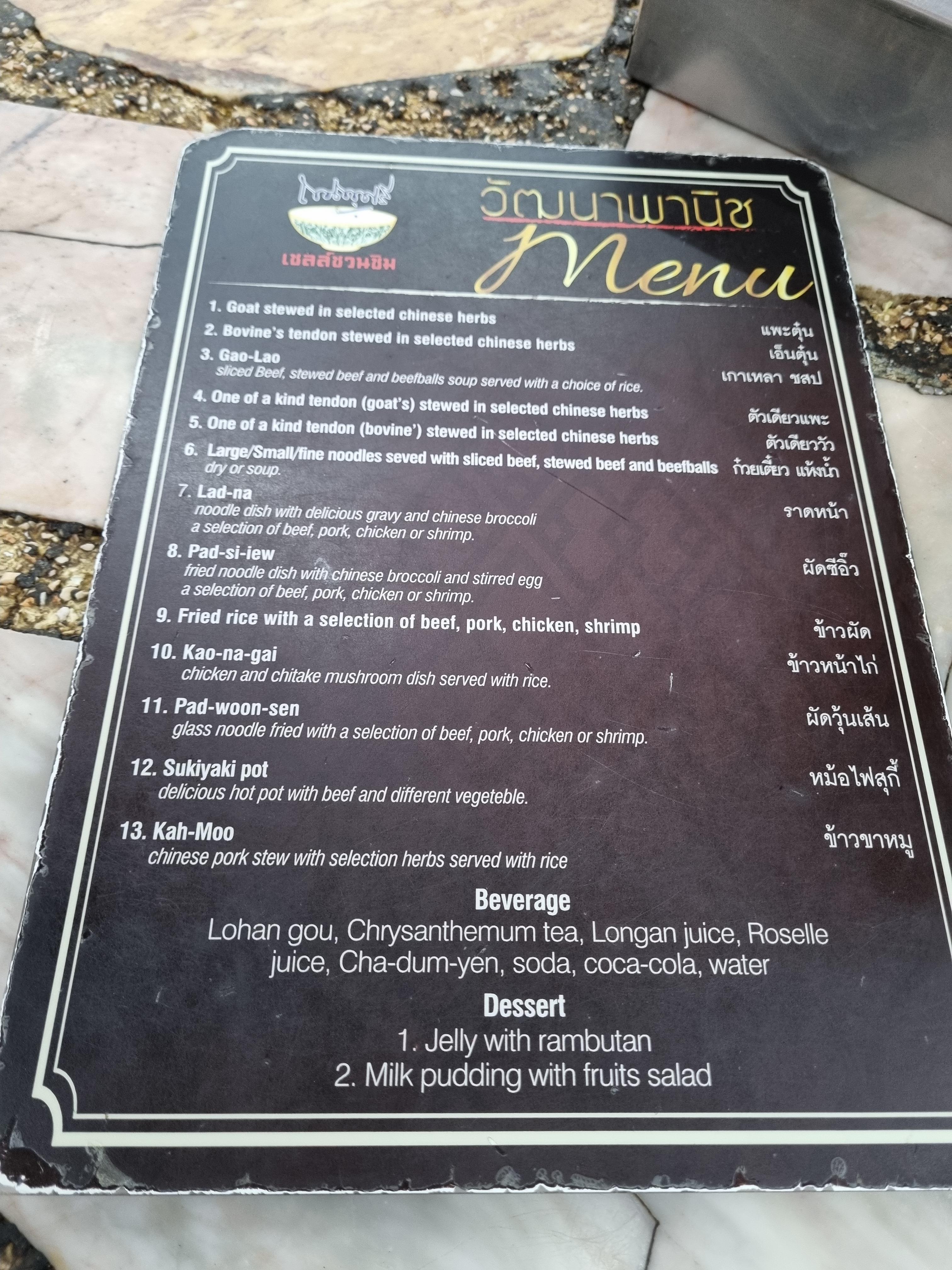 The star of the menu is the Beef Noodle Soup (priced between 100-150 THB, roughly $3.50 to $5.00). The menu features various noodle options, and the noodles are notably thin, which adds a unique touch to the dish.