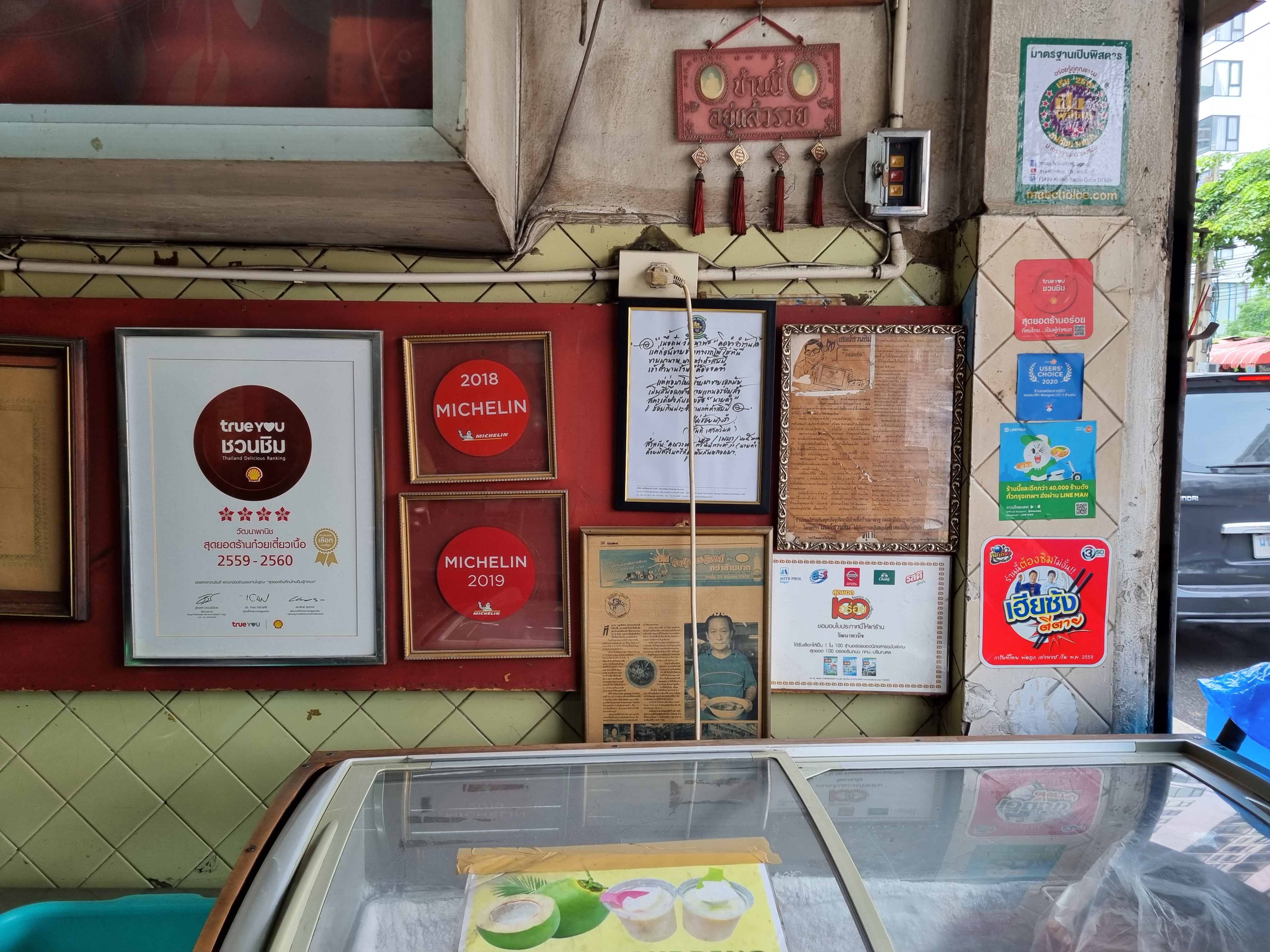 The shop radiates a very local and authentic Bangkok vibe. From the outside, it looks simple, but what immediately catches your eye is the enormous pot at the entrance, where beef broth is simmered all day long. This massive pot is quite impressive, and you can imagine the rich flavors brewing inside. The Michelin sticker proudly displayed at the entrance tells you that this place is Michelin-recommended.