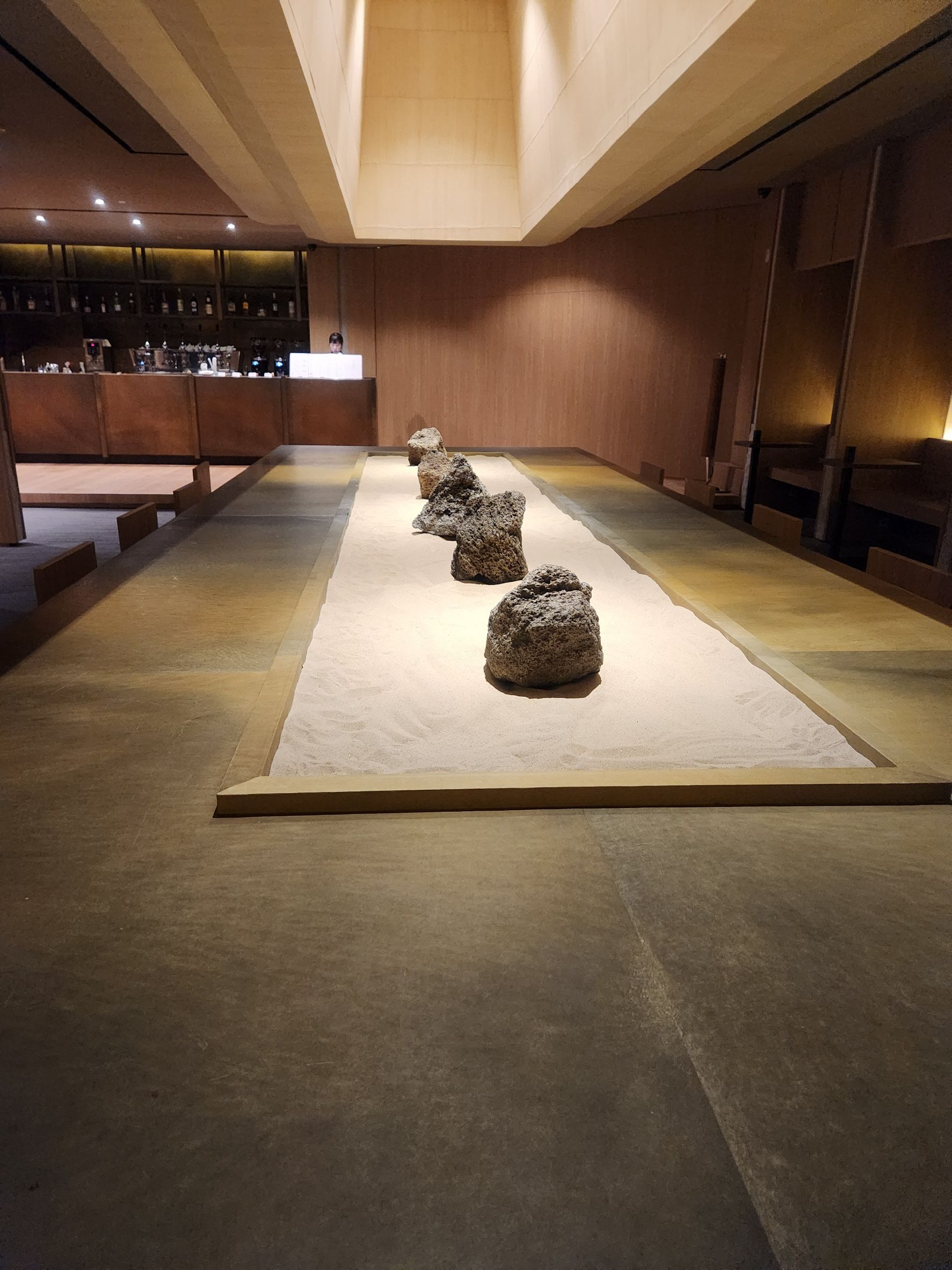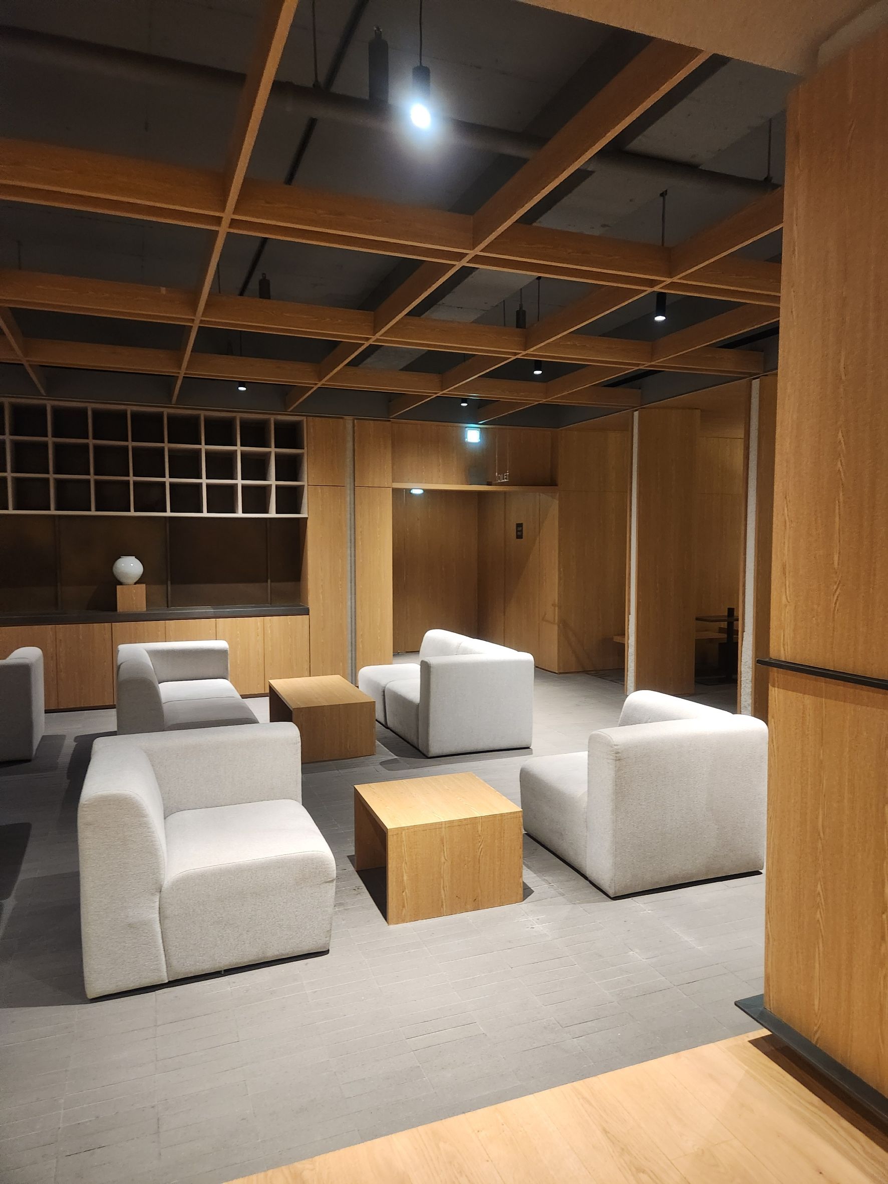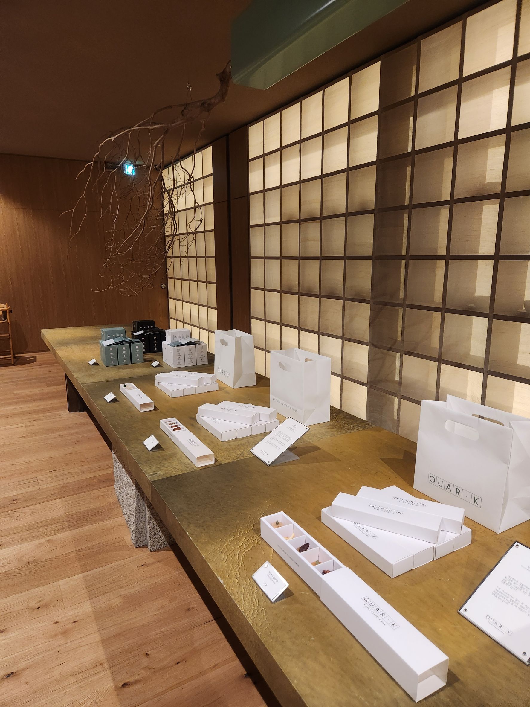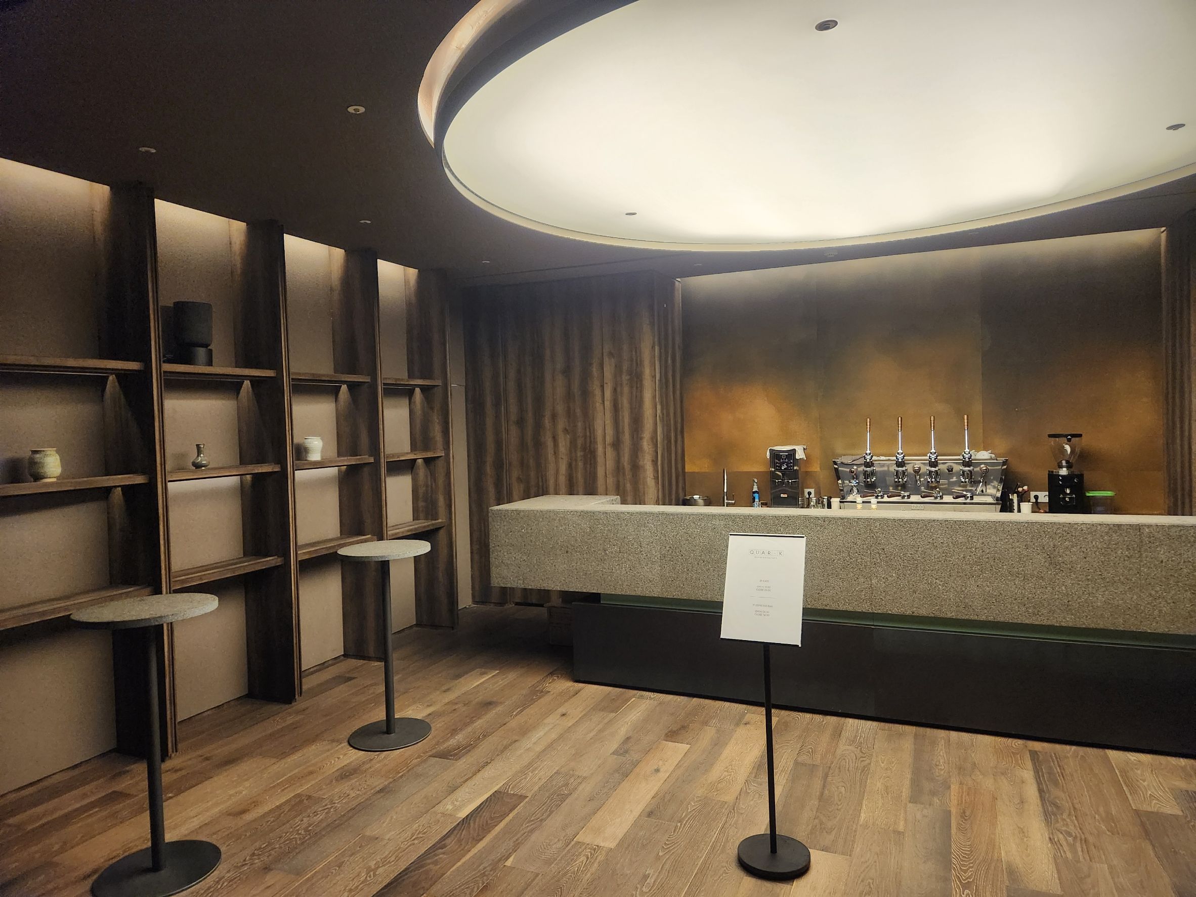 쿼크커피바는 전반적으로 우드톤의 고급스러운 인테리어와 통일된 조명으로 눈에 띄는 카페입니다. 사진에서 볼 수 있듯이 깔끔한 나무 재질과 따뜻한 노란빛 조명이 어우러져 전체 공간이 편안하면서도 세련된 분위기를 자아냅니다. 특히 일본식 정원을 연상시키는 돌 장식은 공간에 독특한 포인트를 줍니다.