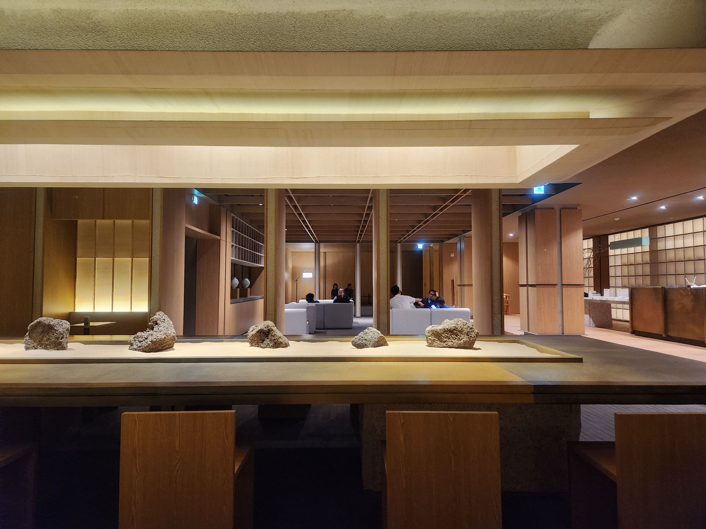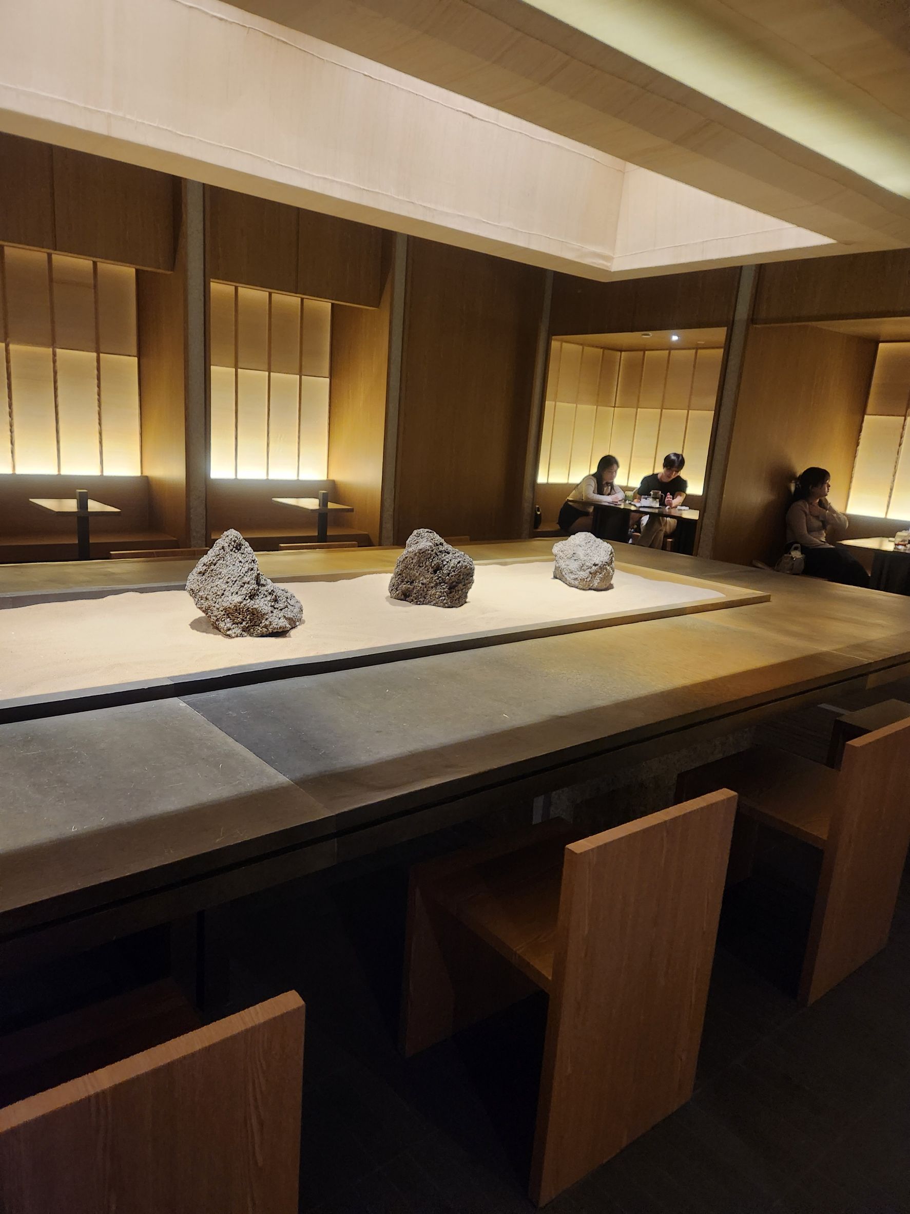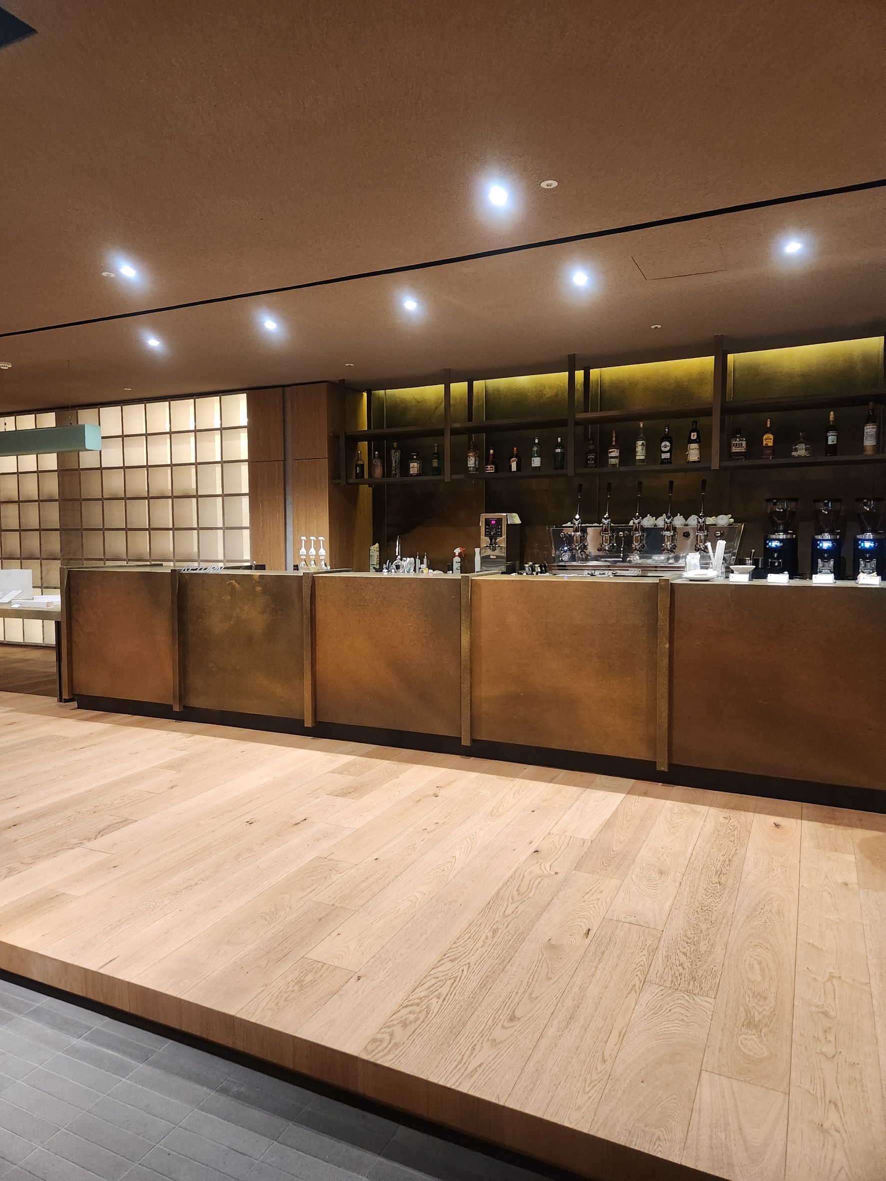 쿼크커피바는 전반적으로 우드톤의 고급스러운 인테리어와 통일된 조명으로 눈에 띄는 카페입니다. 사진에서 볼 수 있듯이 깔끔한 나무 재질과 따뜻한 노란빛 조명이 어우러져 전체 공간이 편안하면서도 세련된 분위기를 자아냅니다. 특히 일본식 정원을 연상시키는 돌 장식은 공간에 독특한 포인트를 줍니다.
