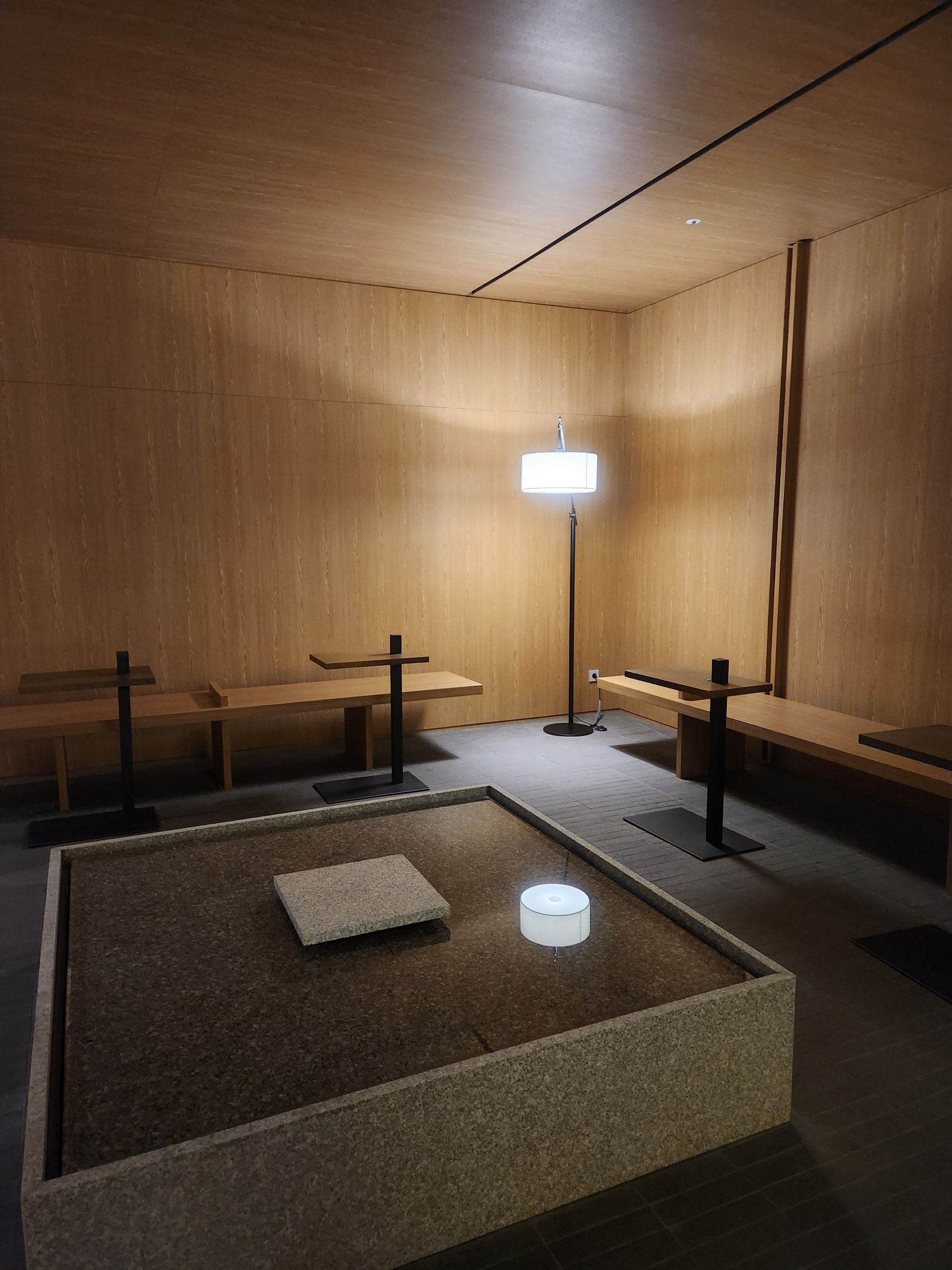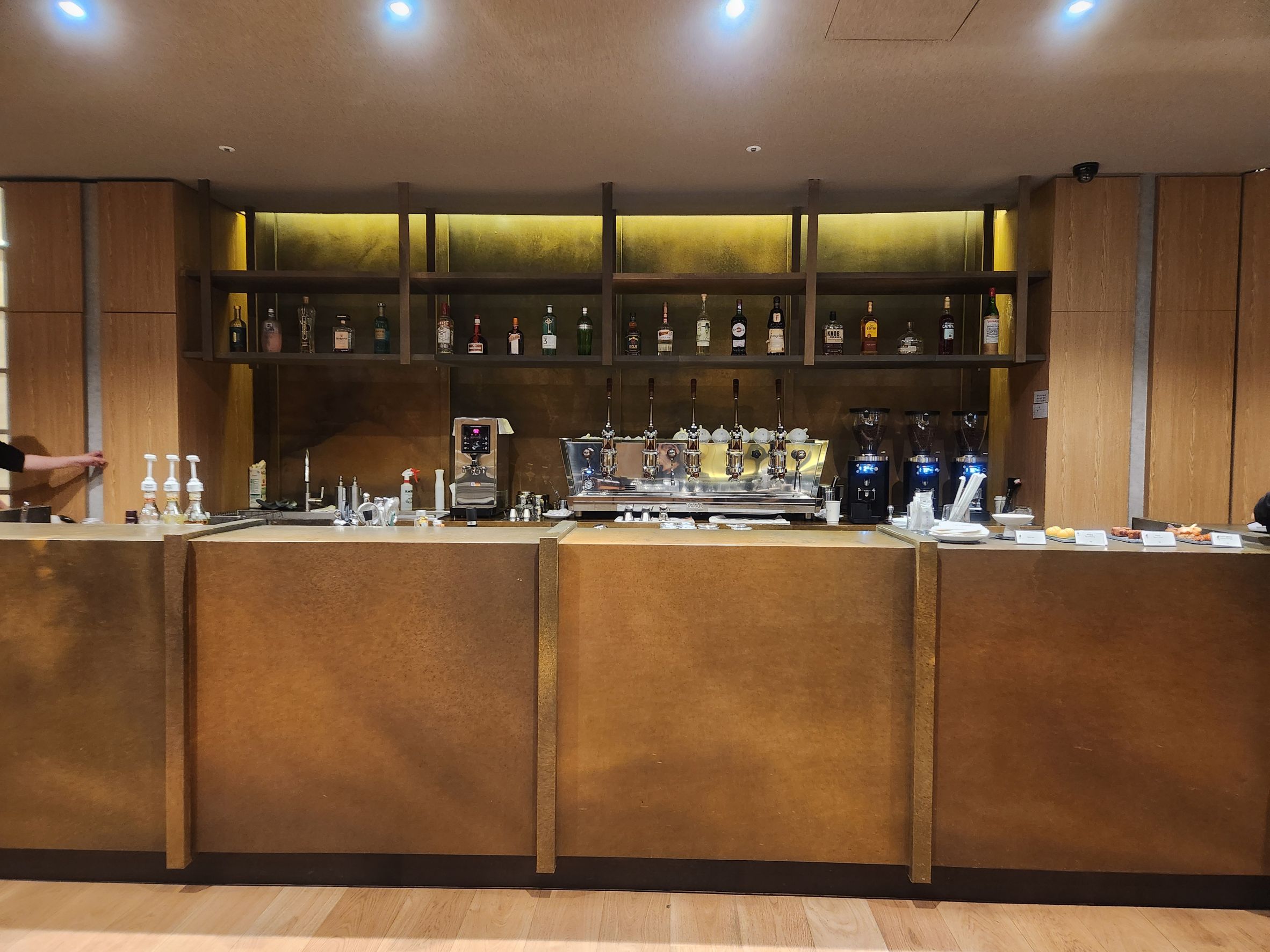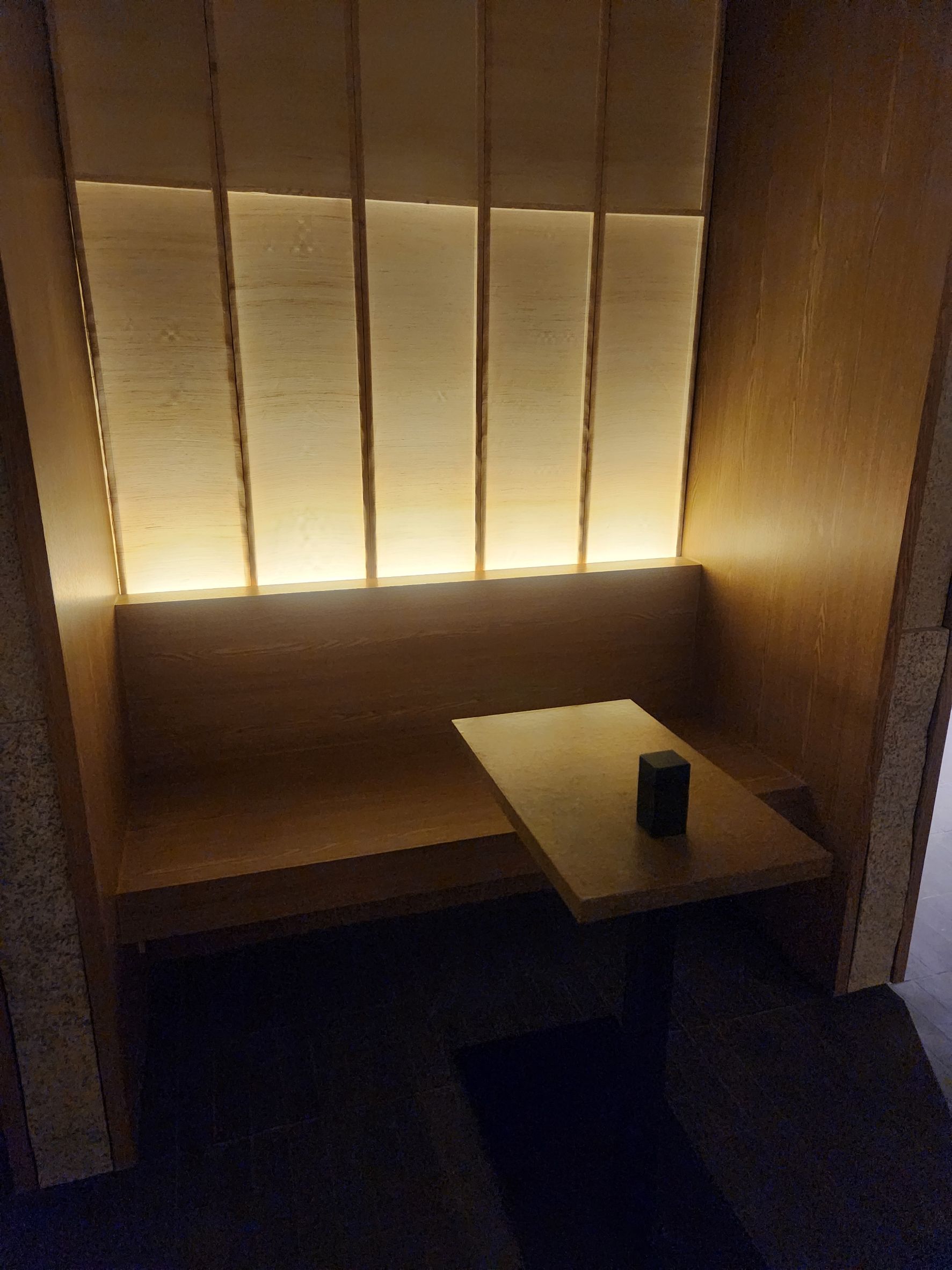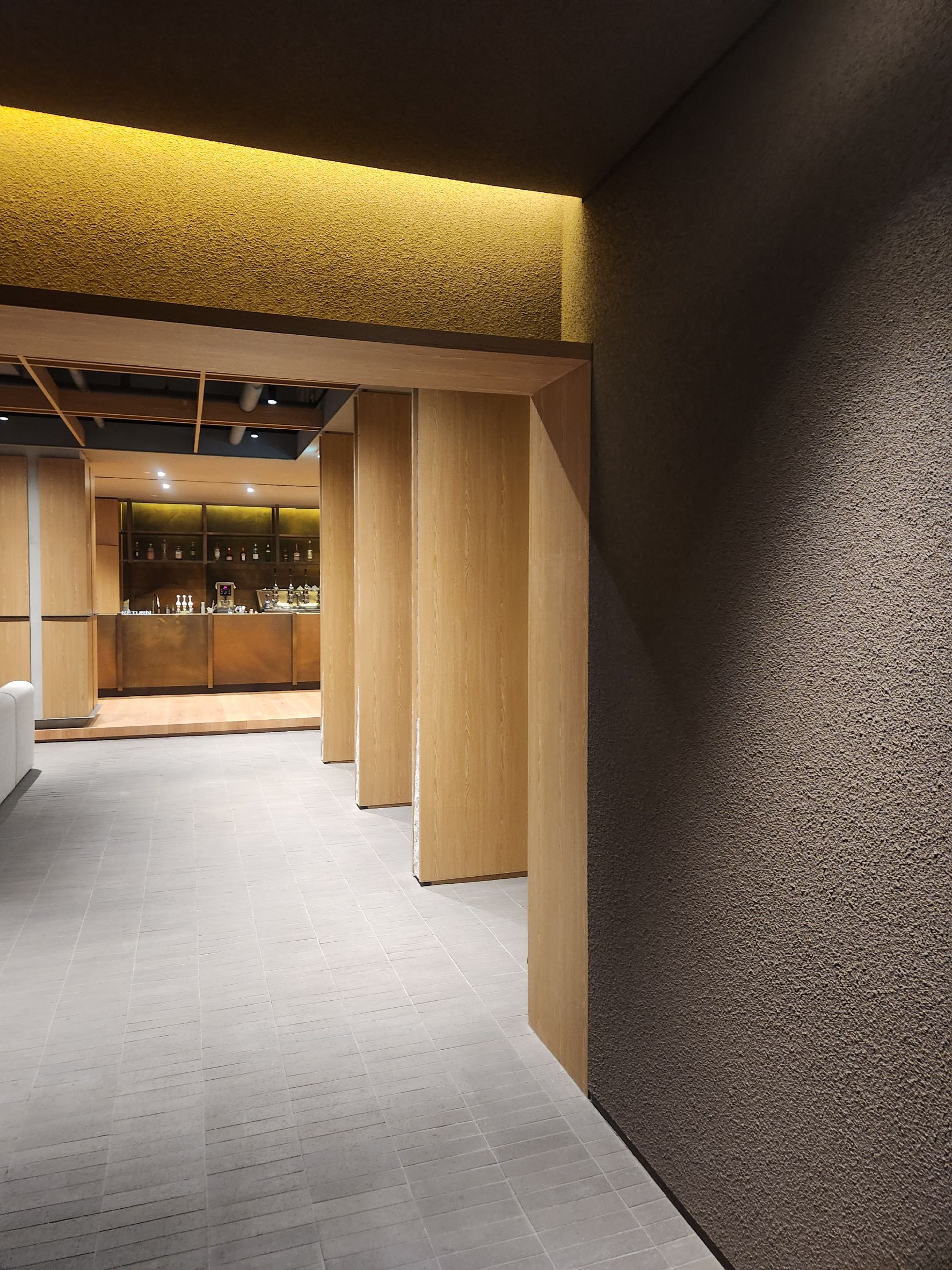 쿼크커피바는 전반적으로 우드톤의 고급스러운 인테리어와 통일된 조명으로 눈에 띄는 카페입니다. 사진에서 볼 수 있듯이 깔끔한 나무 재질과 따뜻한 노란빛 조명이 어우러져 전체 공간이 편안하면서도 세련된 분위기를 자아냅니다. 특히 일본식 정원을 연상시키는 돌 장식은 공간에 독특한 포인트를 줍니다.