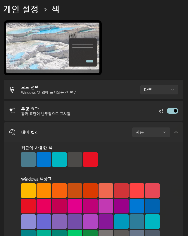 개인 설정 창이 열리면, 왼쪽 메뉴 또는 화면 중앙에서 '색'(Colors) 옵션을 선택하세요.