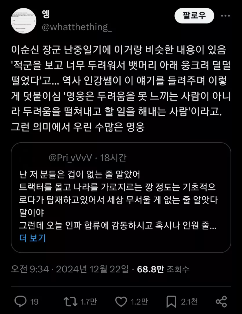 '영웅은 두려움을 못 느끼는 사람이 아니라