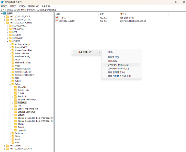 - 새로 만들기 > DWORD(32비트) 값 클릭