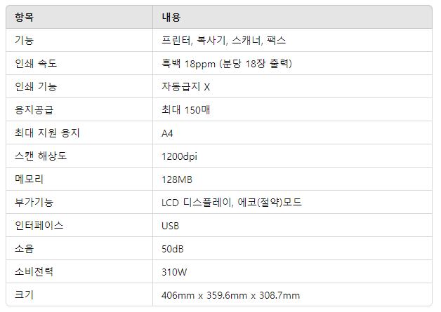 간단한 문서 출력이나 스캔/팩스를 주로 하는 환경에선 훌륭한 선택입니다.