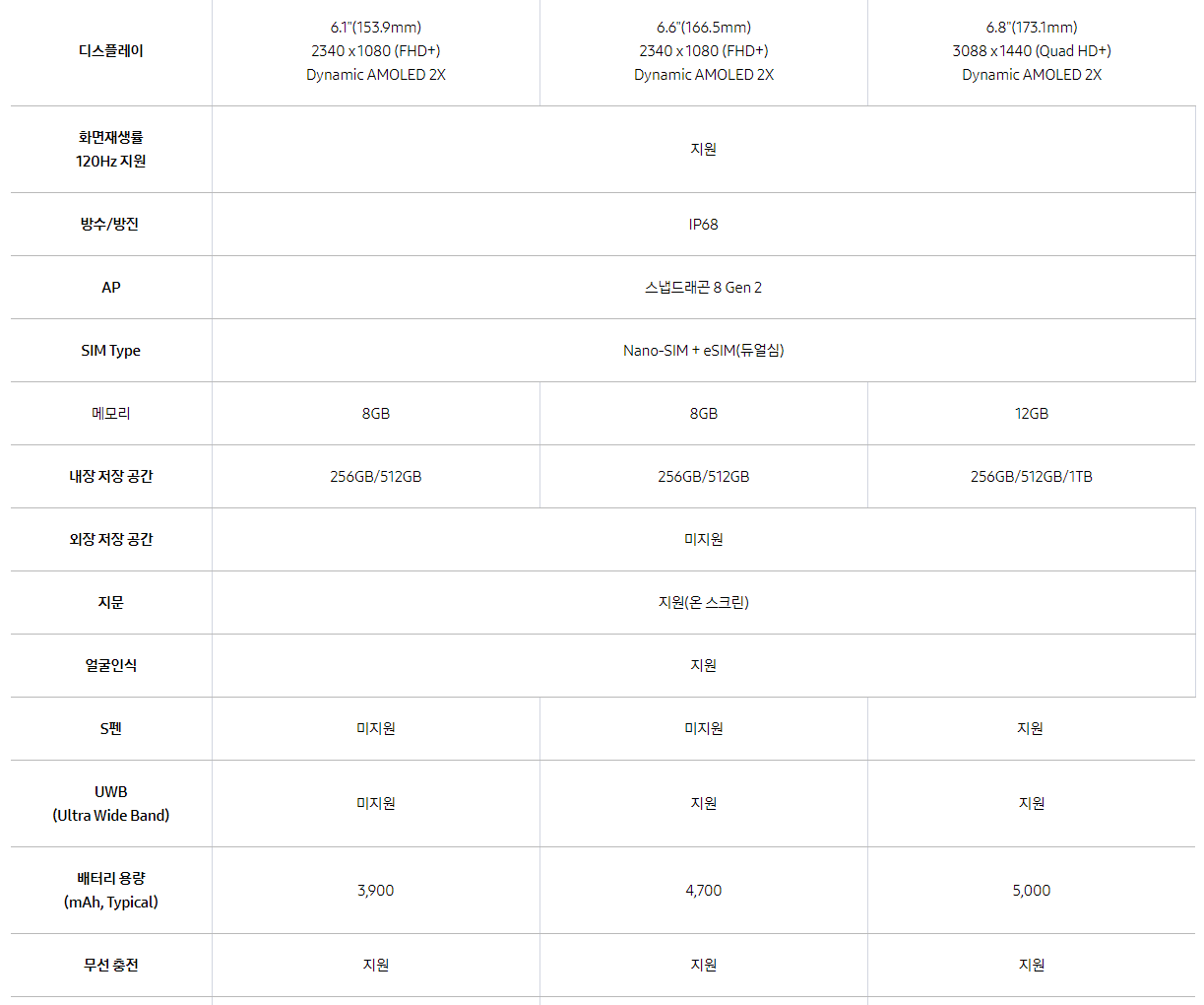 | 항목 | 갤럭시 S23 | S23+ | S23 Ultra |