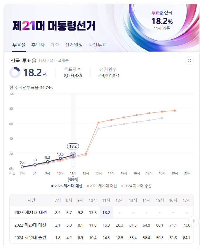 - 11시 기준 투표율이 2022년 대선(18.6%)보다 약간 낮고, 2024년 총선(14.5%)보다는 높음.