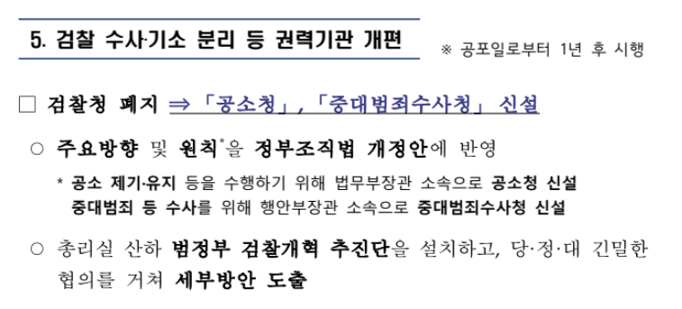 부패·경제·중대범죄 수사 전담. 검찰이 맡던 수사권을 떼어내어 새로운 독립 기관에서 수행. - 총리실 산하 검찰개혁 추진단