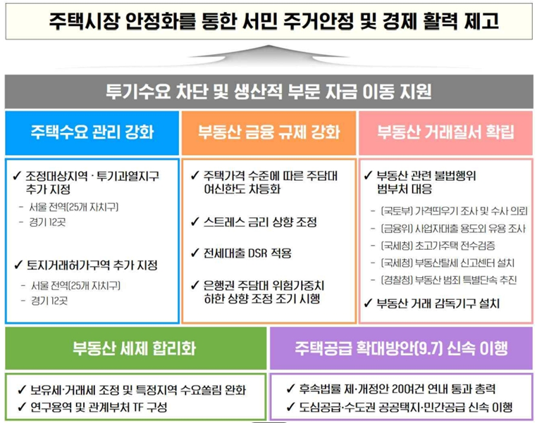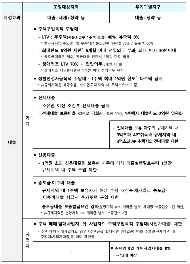 - 신용대출: 1억 원 초과 신용 대출 보유자, 대출 실행일로부터 1년간 규제지역 내 주택 구입 금지.