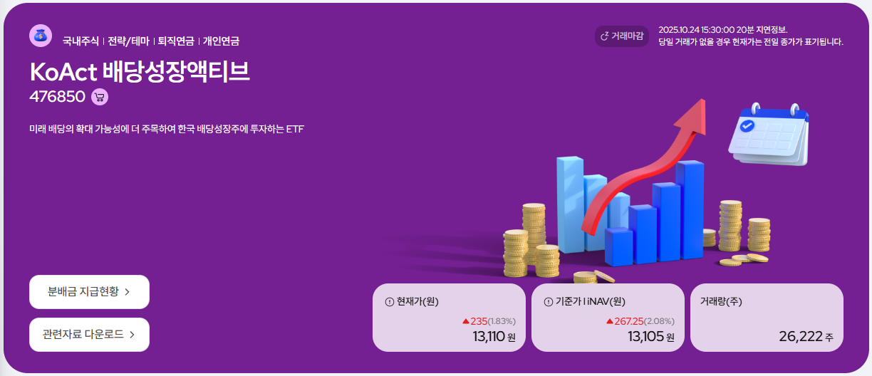 그런 흐름 속에서 등장한 ETF가 바로 삼성액티브 KoAct 배당성장액티브 ETF입니다.