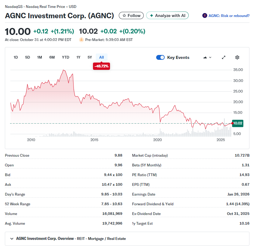 - 2024~2025년 최근 반등 (차트 오른쪽 끝 상승): 2024년 Fed 금리 인하 시작(9월 0.5%포인트 컷)으로 모기지 금리가 안정화되며 MBS 가치가 상승했다. YTD(2025년 누적) +23% 수익률은 이 효과를 반영한다. 2025년 10월 말 기준 주가 10달러로 52주 고점(10.63달러) 근접.