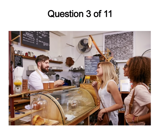 5. (행동) The man is handling with a card machine, maybe women are about to order foods