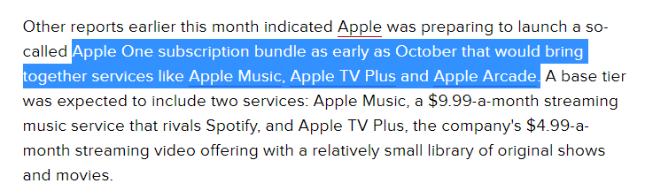 애플뮤직이 애플원(Apple One)이라는 번들 구독 서비스에 포함될 가능성이 있습니다.