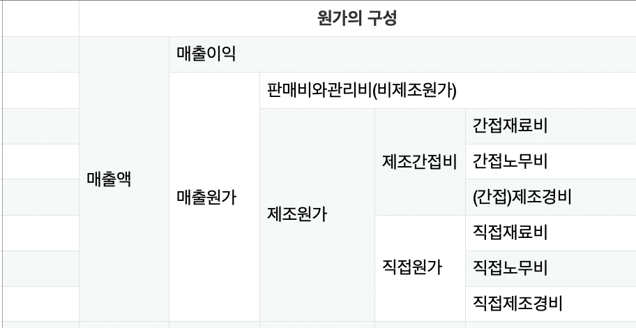 제조원가 = 직접원가(직접재료비 + 직접노무비 + 직접제조경비) + 제조간접비(간접재료비 + 간접노무비 + 간접제조경비)