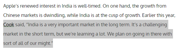 하지만 애플의 CEO 팀 쿡 역시, 현재의 시장이 중국이라면 미래의 시장은 인도임을 확실히 견지하고 있음을 알 수 있습니다.