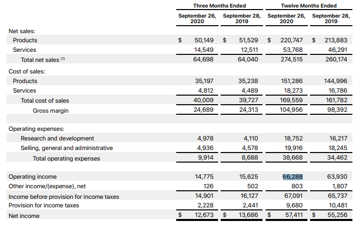그래서 10월 29일 애플에서 발표한 재무제표(CONDENSED CONSOLIDATED STATEMENTS OF OPERATIONS (Unaudited) (In millions, except number of shares which are reflected in thousands and per share amounts))를 한 번 더 보고, 앞으로 어떤 부분에서 성장의 가능성이 더 있을까.. 라는 생각을 해봤습니다.