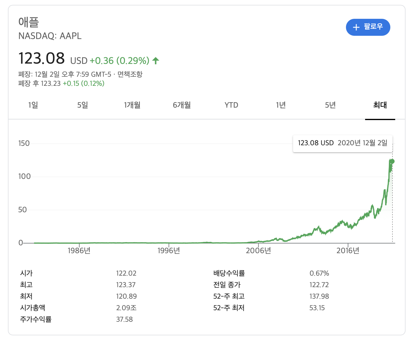 끝없이 오르는 애플 주식..이지만 주가수익률(PER)은 여전히 37.58 정도로 높다고 하기는 그렇고 낮다고 하기도 참 그렇습니다.
